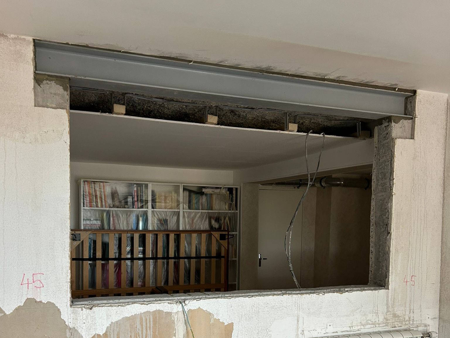 La stabilité du mur a été maintenue grâce à la mise en place de linteaux métalliques en HEA 160, scellés sur appuis latéraux avec un mortier structurel adapté, assurant une transmission homogène et durable des charges. Après durcissement complet des scellements, l’étaiement a été retiré et les finitions ont été réalisées.
