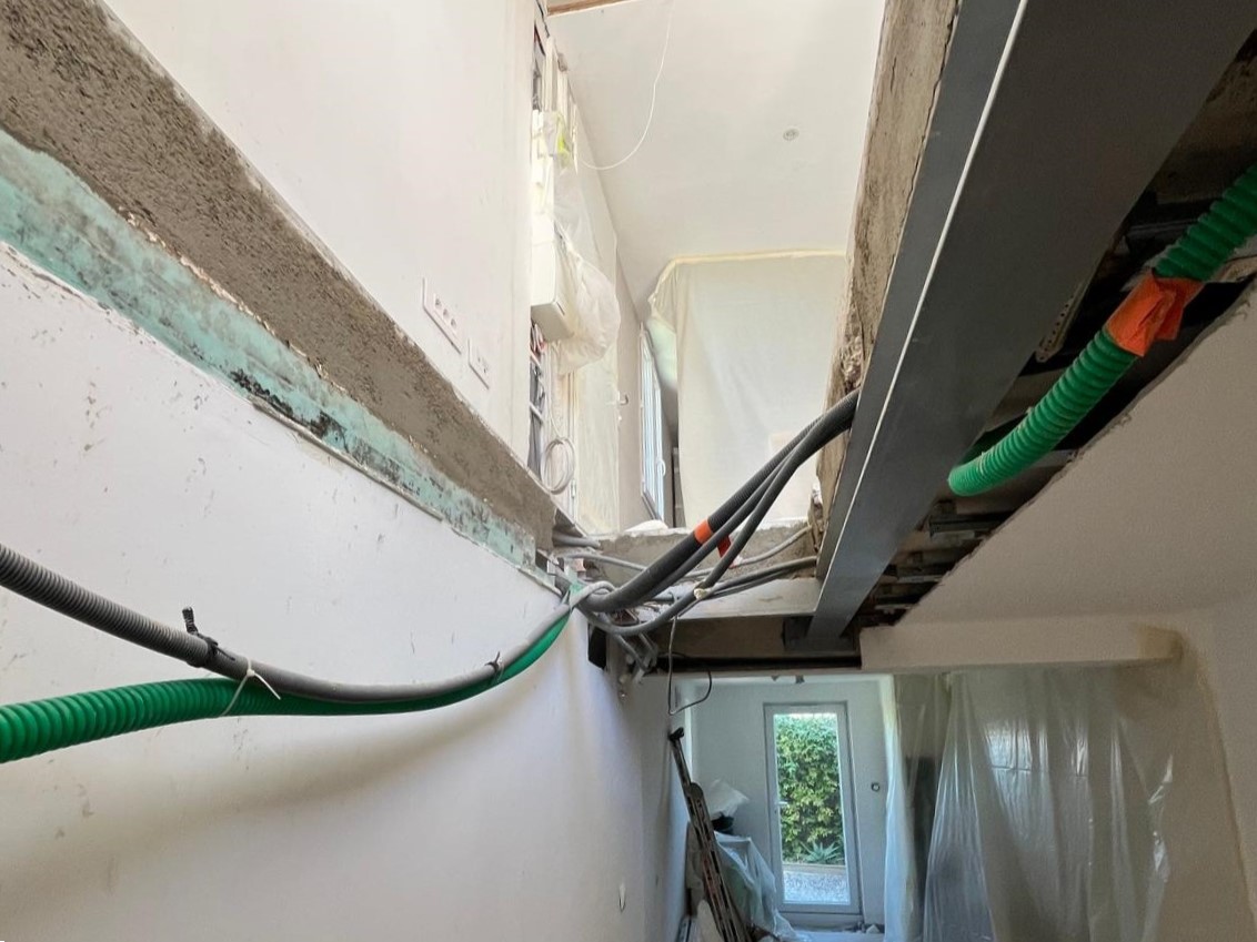 Avant toute intervention, les espaces intérieurs ont été soigneusement protégés : bâches, sols, menuiseries et mobilier ont été couverts afin de préserver l’existant pendant les travaux. Un étaiement vertical a ensuite été mis en place pour sécuriser les planchers.