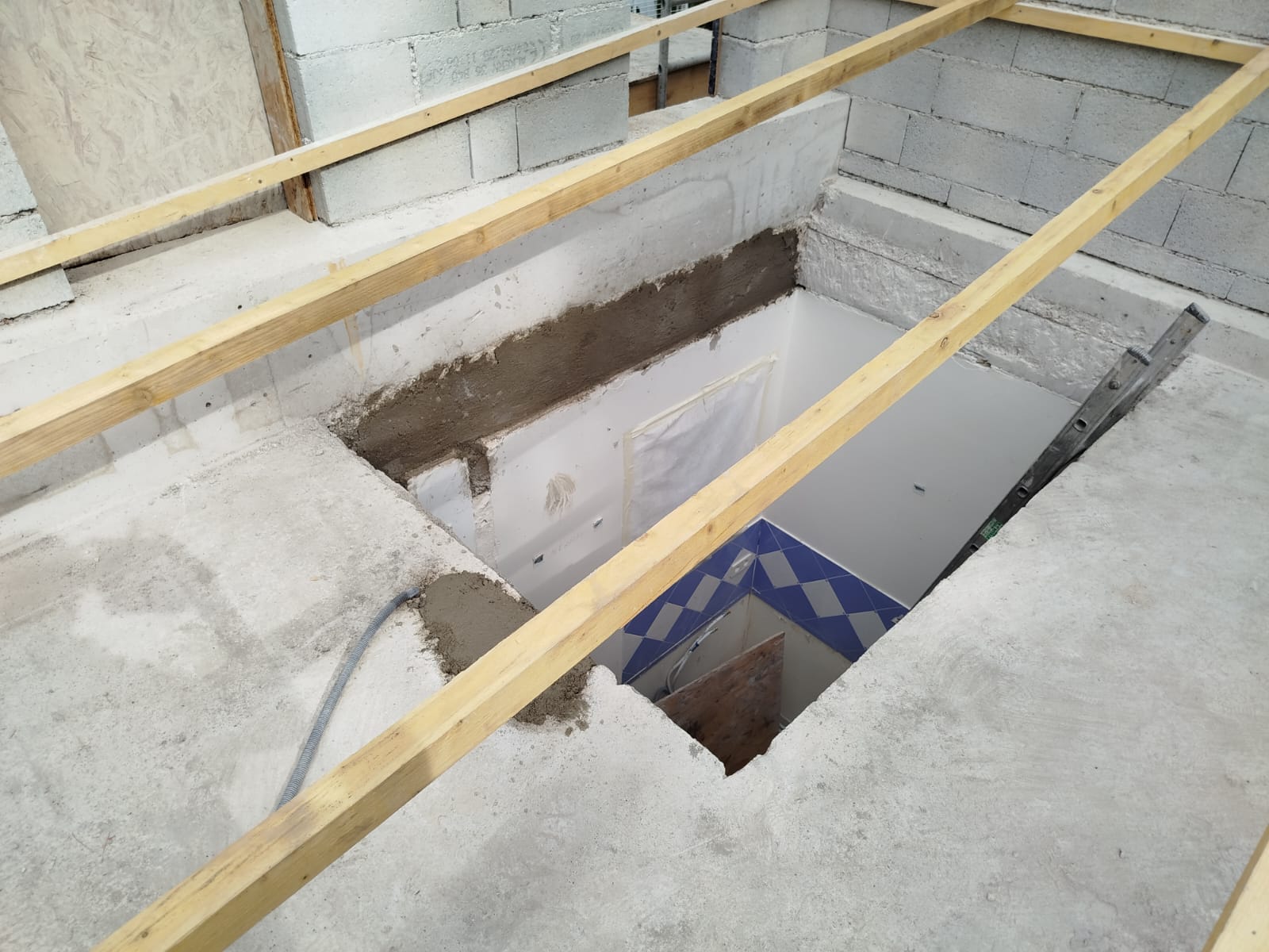 Une fois le plancher sécurisé, l’emplacement de la trémie a été tracé conformément aux plans de l’ingénieur structure. La découpe du béton a été réalisée avec précision, en respectant les phasages définis pour minimiser l’impact sur la structure existante. L’ouverture a permis de créer un espace suffisant pour l’installation d’un escalier reliant les deux niveaux.