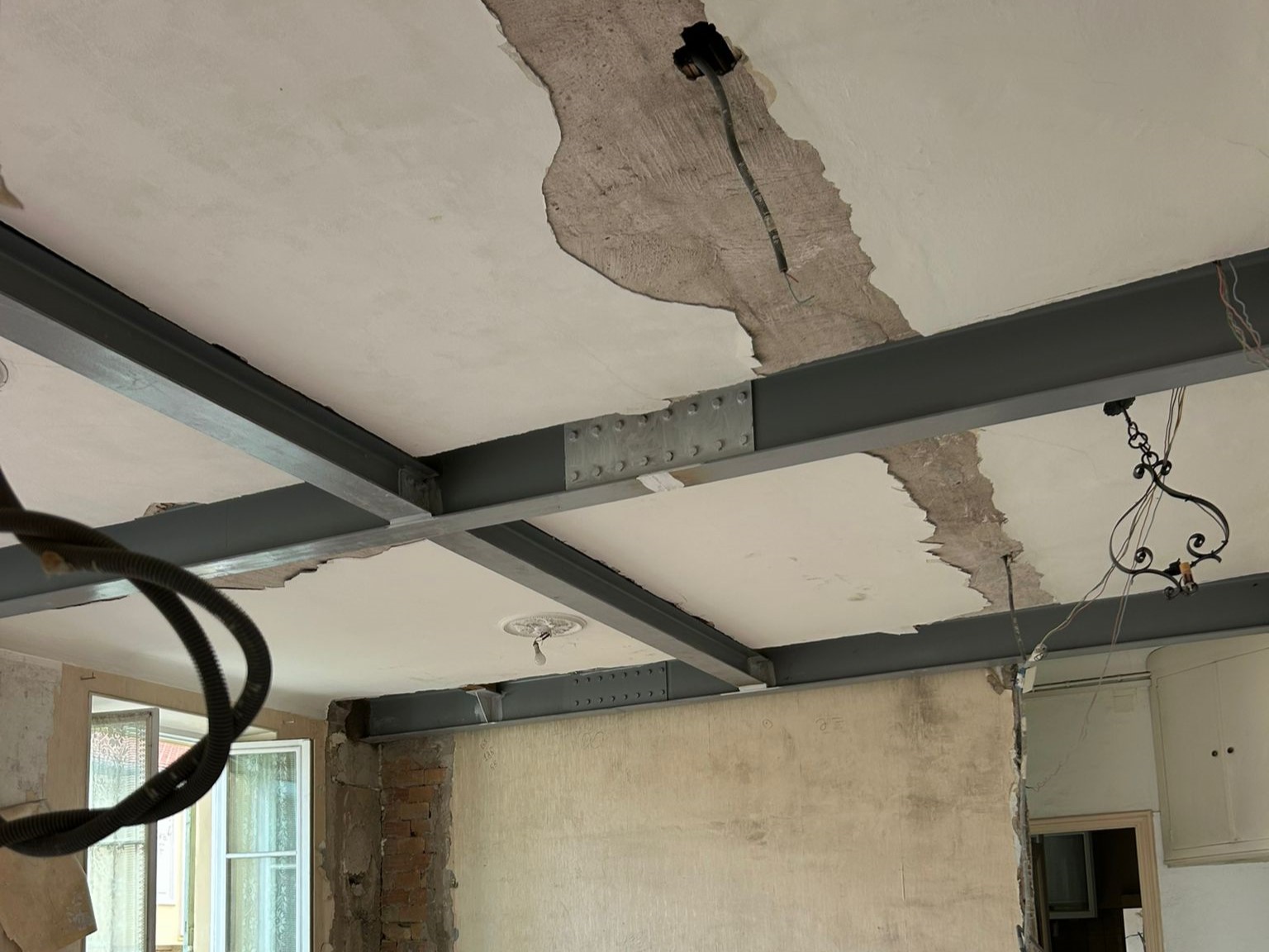 Avant toute démolition, une phase d’étaiement des solives en bois a été mise en place pour sécuriser le plancher et l’étage supérieur. Cette étape a permis de maintenir la stabilité de l’ensemble tout en préparant le chantier pour la démolition des cloisons et la redistribution des espaces.